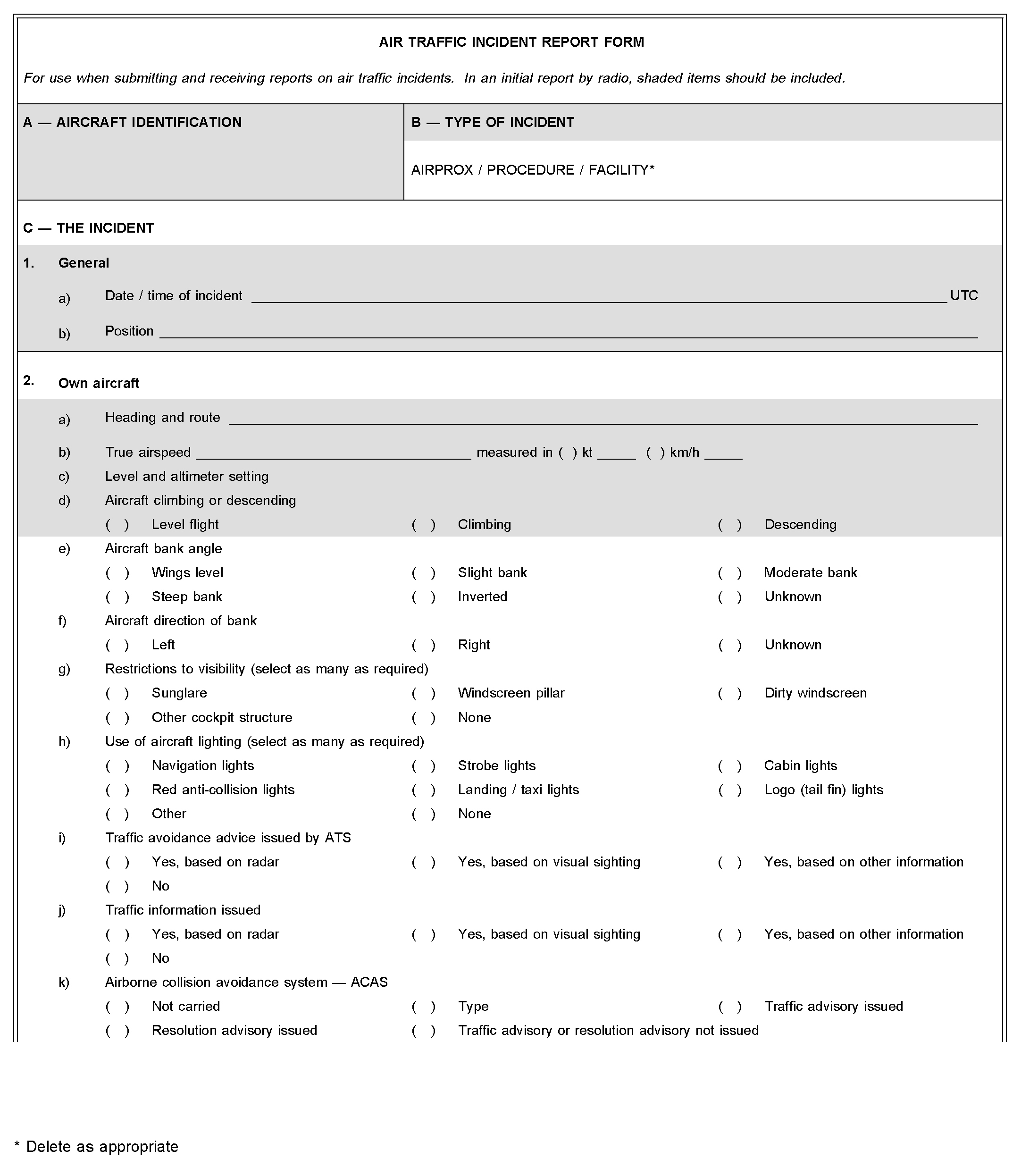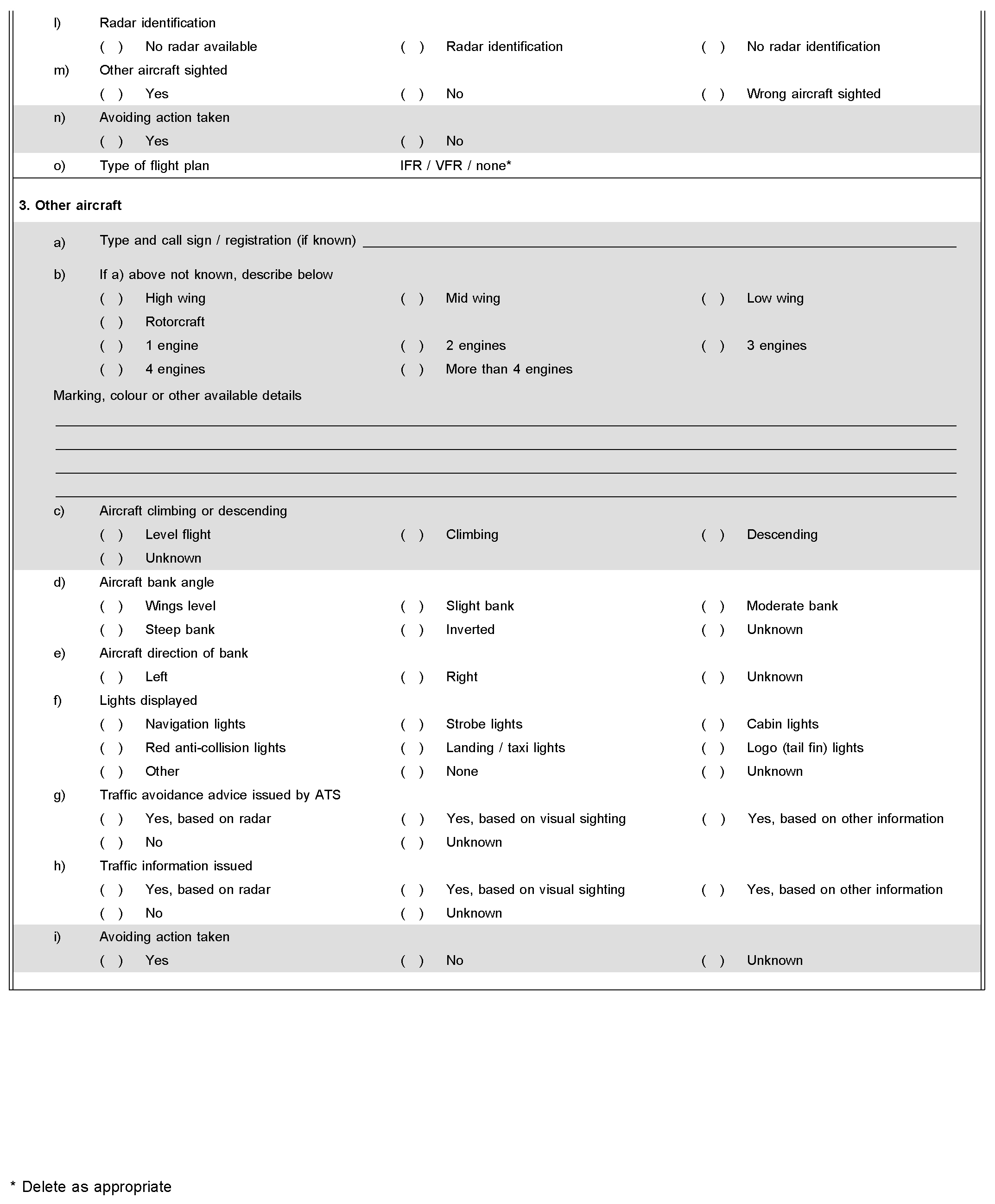 3.3 The confirmatory report on an incident of major significance initially reported by radio or the initial report on any other incident should be submitted to the ATS Reporting Office of the aerodrome of first landing; then, be forwarded to The Directorate of Transports. The pilot should complete the Air Traffic Incident Report Form, supplementing the details of the initial reports as necessary.